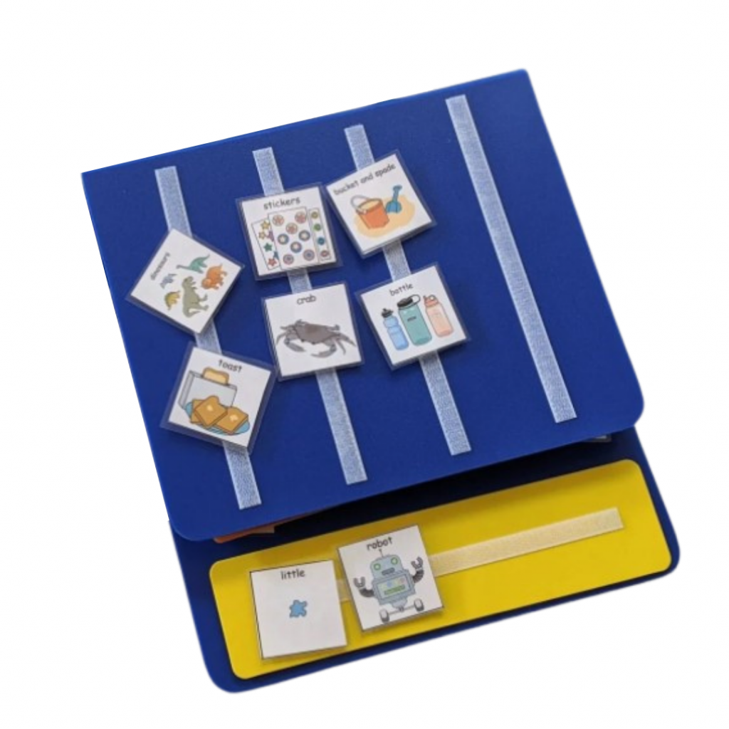 The equipment used in PECS is relatively simple and inexpensive. The types of symbols can be tailored to meet individual needs. For example, large or small pictures, coloured or line drawn, symbols or photographs. At the beginning, the pictures can be mounted on blocks of foam if the child has difficulty handling laminated paper symbols.