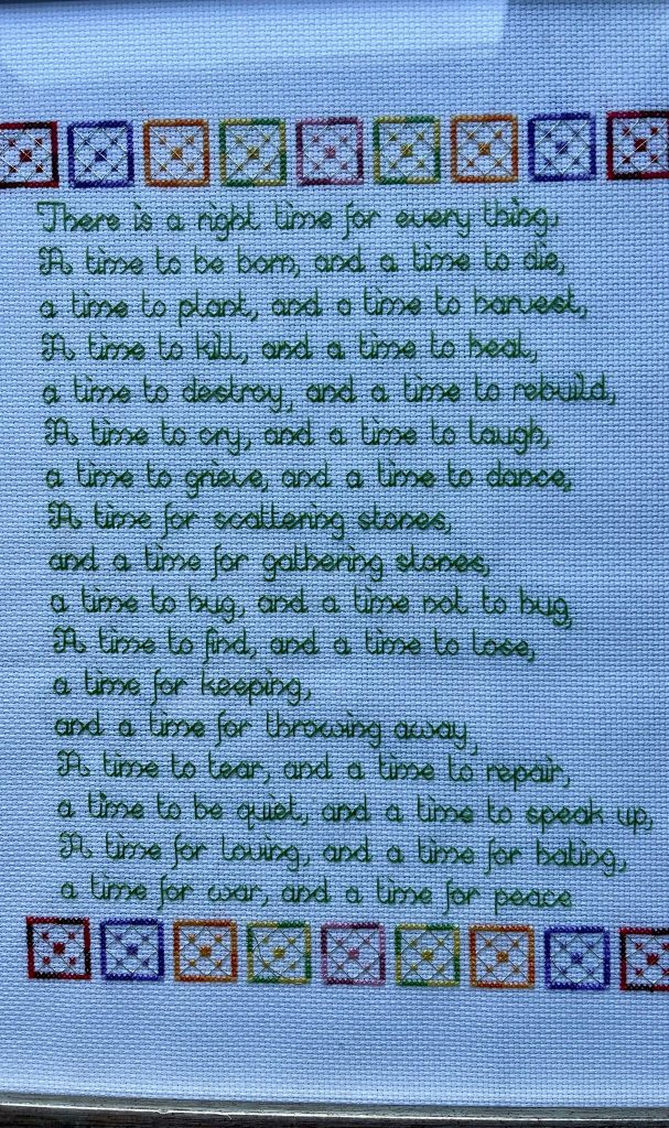 The text is a quote from the Bible in Ecclesiastes chapter 3. When reading through the Bible each year, I had previously quickly read this chapter and moved on without lingering. I found it to be somewhat less than encouraging with words and phrases such as: die, uproot, kill, tear down, weep, mourn, scatter, refrain, give up, throw away, hate and war. Not exactly mood boosting stuff!